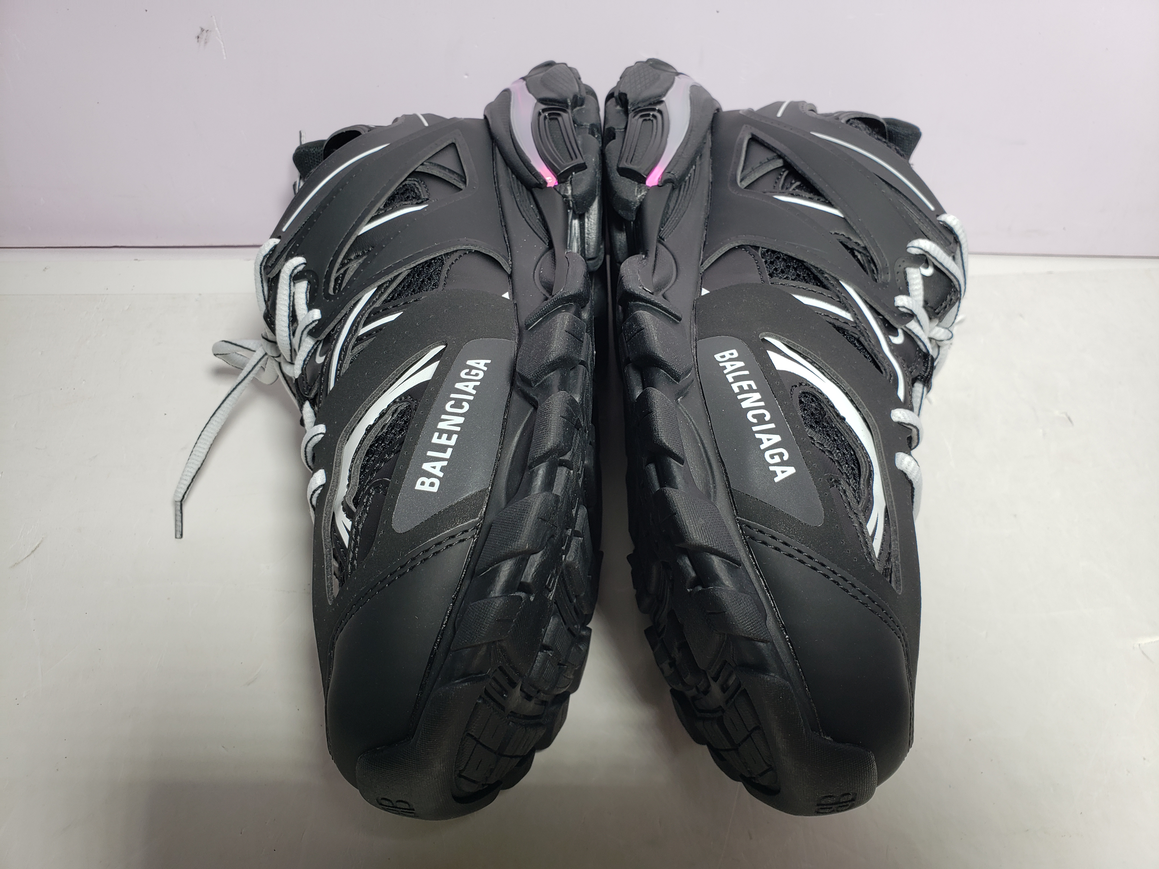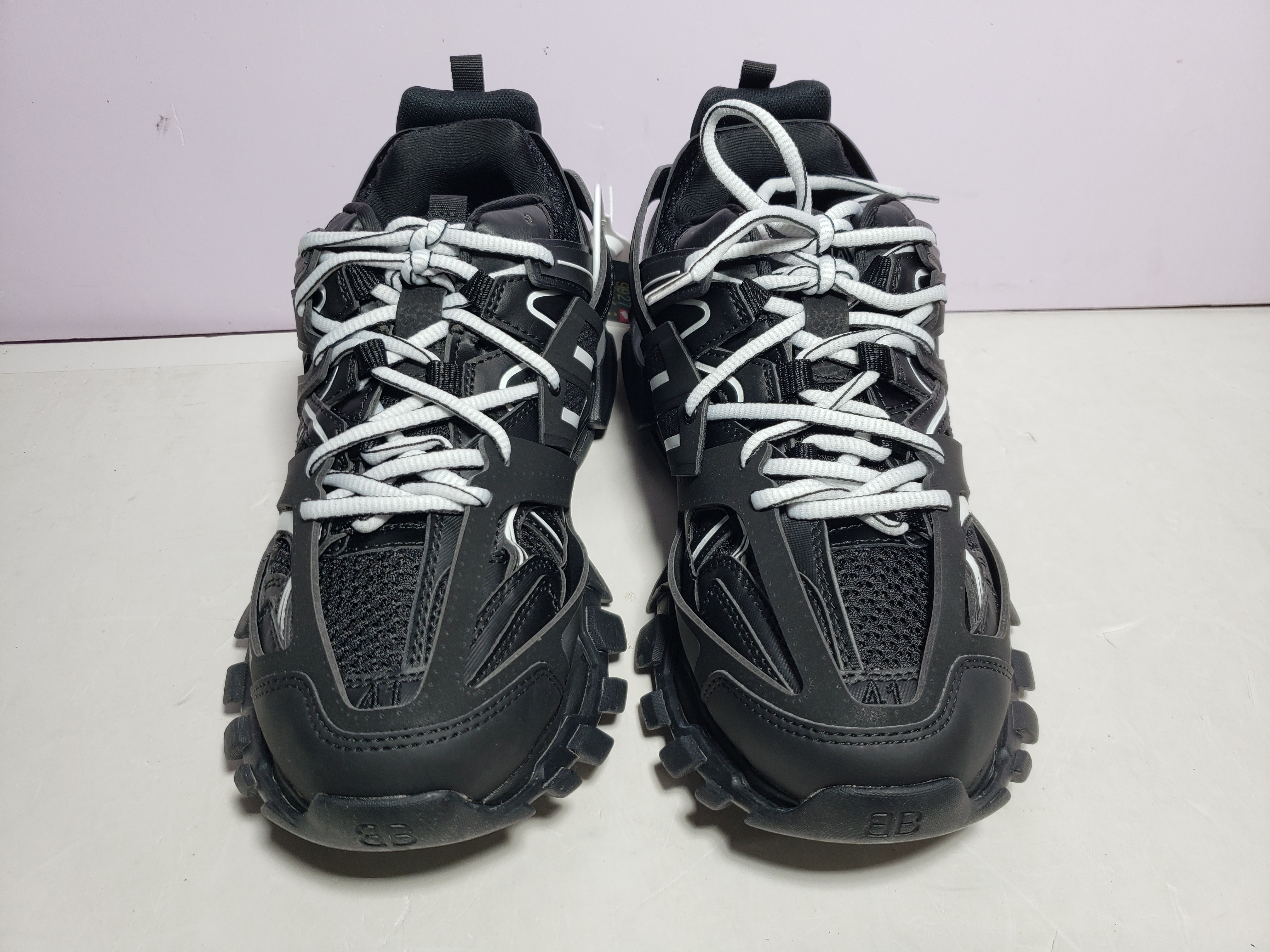 The Track series is mainly made of mesh and nylon, no leather. The size is marked on the edge of the toe. Track embossing on the back of the heel. The front of the outsole is decorated with BB embossing. Logo embossed on tongue. The inner and outer layers are pierced with shoe holes, corresponding to two pairs of shoelaces respectively, and the ends can be tied with double knots.