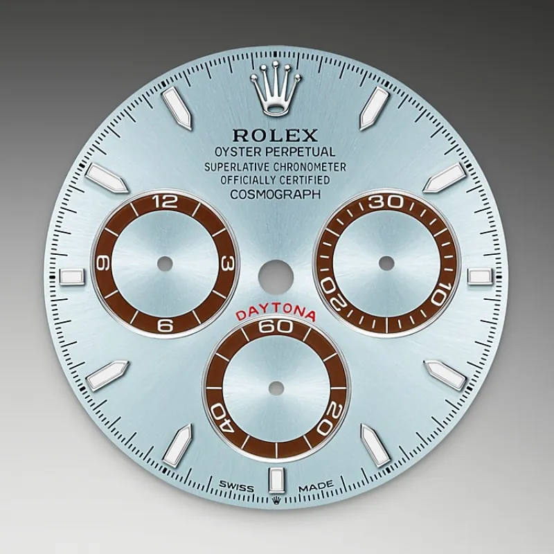 This Rolex has a 40mm platinum case, an Oystersteel three-grid solid link strap, an integrated chestnut brown Cerachrom ceramic outer ring with molded numbers and scales. It also uses an ice blue dial, and each dial is a miniature work of art. The colour, reflections and surface texture, along with decorative elements and the overall design give the watch its intrinsic character.